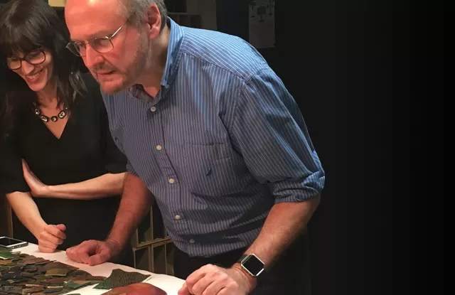 Similarly intrigued by Tiffany’s glass formulations, Greg conducted XRF analysis on examples of iridescent as well as metallic leaf-backed glass from The Neustadt’s Tiffany Glass Archive. His reports confirm and document the high degree of experimentation and technical complexity of Tiffany’s glass chemistry and manufacturing processes. Greg’s groundbreaking iridescence research inspired The Neustadt’s exhibition Tiffany’s Iridescence: Glass in Rainbow Hues at the Queens Museum (2018–2020). He served as an enthusiastic consultant and advisor for the show, graciously answering detailed questions about glass chemistry and terminology. To illustrate the aesthetic differences and technical innovations of Tiffany’s shimmering surfaces, Greg also loaned from his personal collection marvelous specimens of iridescent glass that predate Tiffany’s work. The resulting exhibition was the first of its kind—examining the science behind Tiffany’s glass artistry—and it made manifest Greg’s decades of iridescent and luster research, analysis, and collecting efforts.